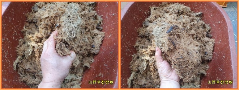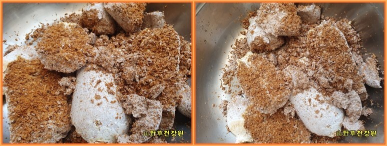 이 부셔진 종균을 칡건지에 골고로 섞이게 버무려 주시면 되겠습니다.